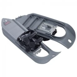 Le cadre, qui est habituellement en aluminium ou en plastique, est ici constituĂ© d’un tube gonflable, comparable Ă un canot pneumatique, mais en miniature. De cette façon, la paire de raquettes n’est pas plus grande qu’une bouteille d’un litre et pèse Ă peine plus d’un kilogramme, donc elle se range facilement dans un sac Ă dos. Le tube crĂ©e la portance nĂ©cessaire dans la neige molle. Une fois que la neige s’est un peu tassĂ©e, les crampons avant assurent l’adhĂ©rence nĂ©cessaire sur la surface dure.